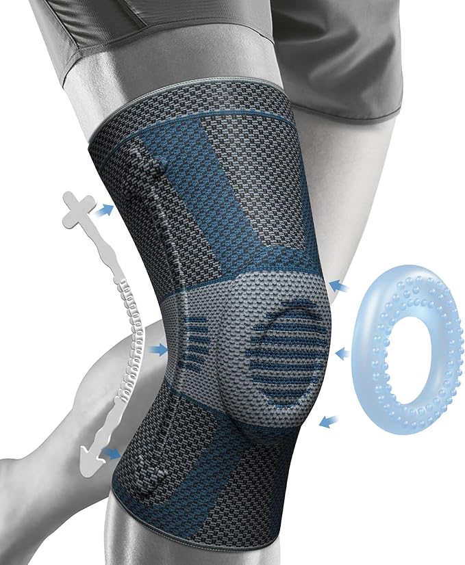 - EXCLUSIVE PATENT--- Horizontal Knit Technology: An anatomically contoured patella gel pad surrounds your kneecap, double-sided metal spring stabilizers fit tightly with your knee joint. These special functional element strengthen side support and maintains joint stability. It will effectively disperses joint pressure, keeping your knee warm, lubricating your joints, accelerate blood circulation. BEST CHOICE for sports protection and pain relief.