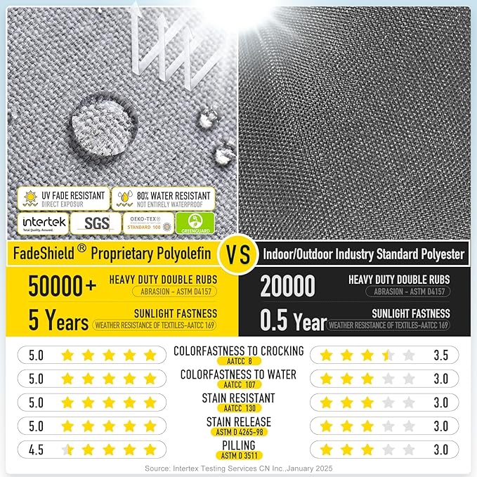 - 【FadeShield - UV Fade Resistant】FadeShield Proprietary Polyolefin are dependable indoor/outdoor performance fabrics, they are infused with antimiсrоbial silver Ion technology and can withstand 5 years of UV fade resistance, solution-dyed to make sure that each color is deeply ingrained in every fiber for continued vibrancy, even after heavy use. 80% water resistant (not entirely waterproof). We recommend bringing it indoors when it rains or when not in use to preserve its lifespan and keep it looking beautiful.