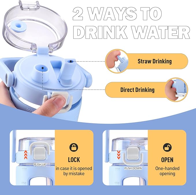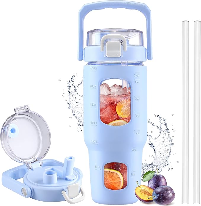 BLUEGO 32oz Glass Tumbler with Lid and Handle, Iced Coffee Cup with Straws, Glass Water Bottle with Silicone Sleeve and Volume, Marker Glass Cup with Time Marking, BPA Free, Blue