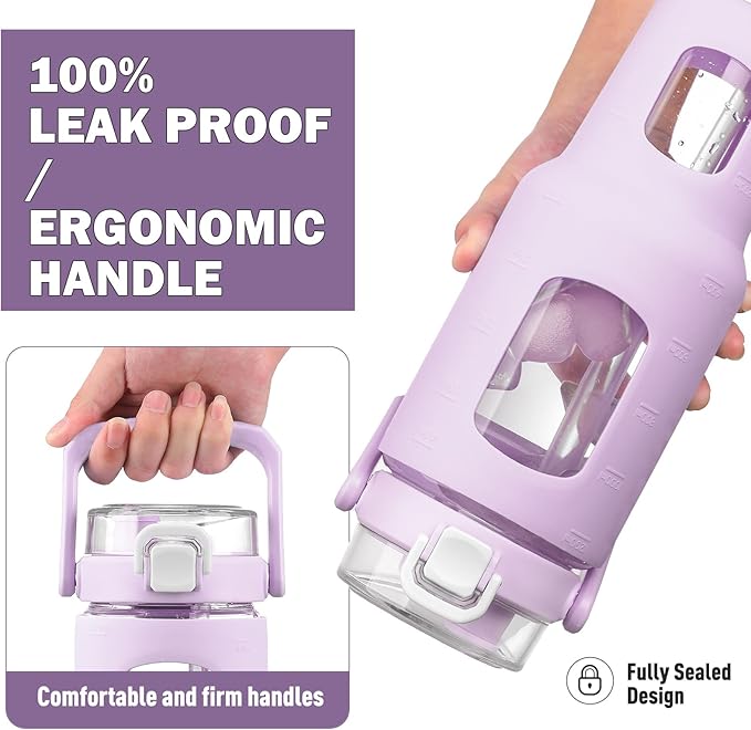 BLUEGO 40oz Glass Tumbler with Lid and Straw, Glass Water Bottles with Handle, Glass Cup with Time Marker and Silicone Sleeve, Fits Most Cup Holder, Leak-proof, Purple