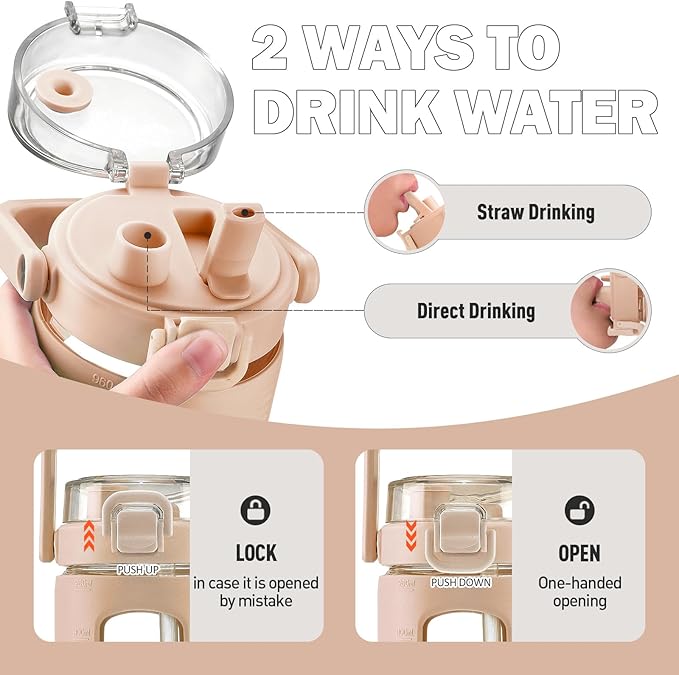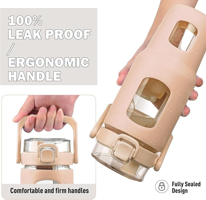 BLUEGO 32oz Glass Tumbler with Lid and Handle, Iced Coffee Cup with Straws, Glass Water Bottle with Silicone Sleeve and Volume, Marker Glass Cup with Time Marking, BPA Free, Amber