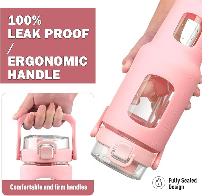 BLUEGO 40oz Glass Tumbler with Lid and Straw, Glass Water Bottles with Handle, Glass Cup with Time Marker and Silicone Sleeve, Fits Most Cup Holder, Leak-proof, Pink