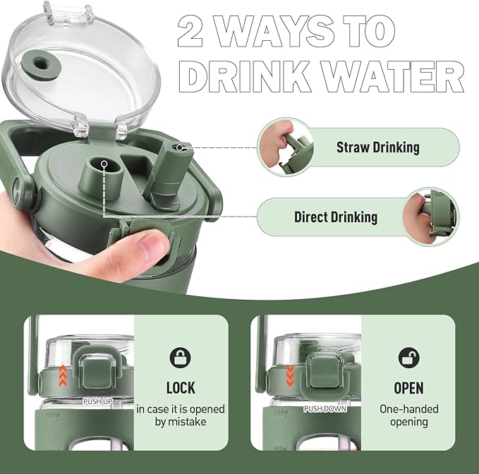 BLUEGO 40oz Glass Tumbler with Lid and Straw, Glass Water Bottles with Handle, Glass Cup with Time Marker and Silicone Sleeve, Fits Most Cup Holder, Leak-proof, Olive