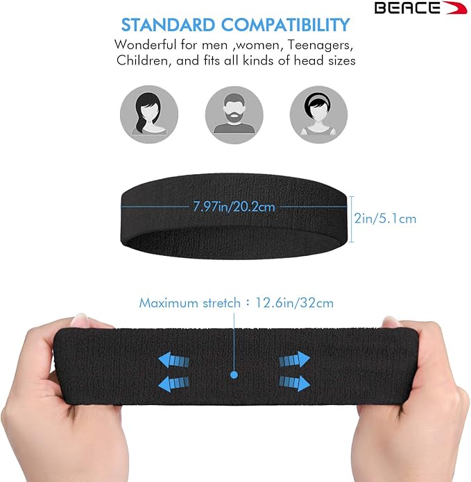 BEACE Sweatbands Sports Headband for Men & Women - 6PCS Moisture Wicking Athletic Cotton Terry Cloth Sweatband for Tennis, Basketball, Running, Gym, Working Out