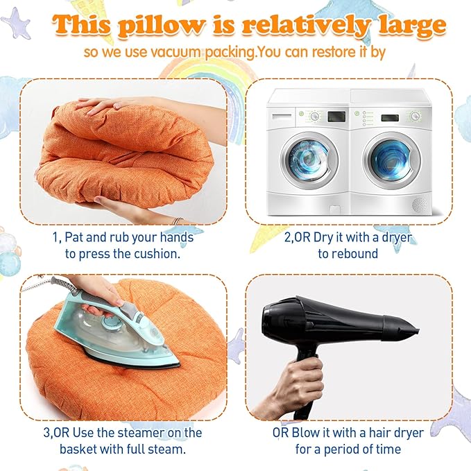 - Quality and Soft: the round floor pillow for kids is made of quality polyester fiber fabric, filled with soft and stretchy PP cotton, soft and safe, not easy to run cotton, not easy to deform or fade, and can serve for a long time; Please notice that due to vacuum pack, cushions can spring back to its normal shape about 1 day after opening