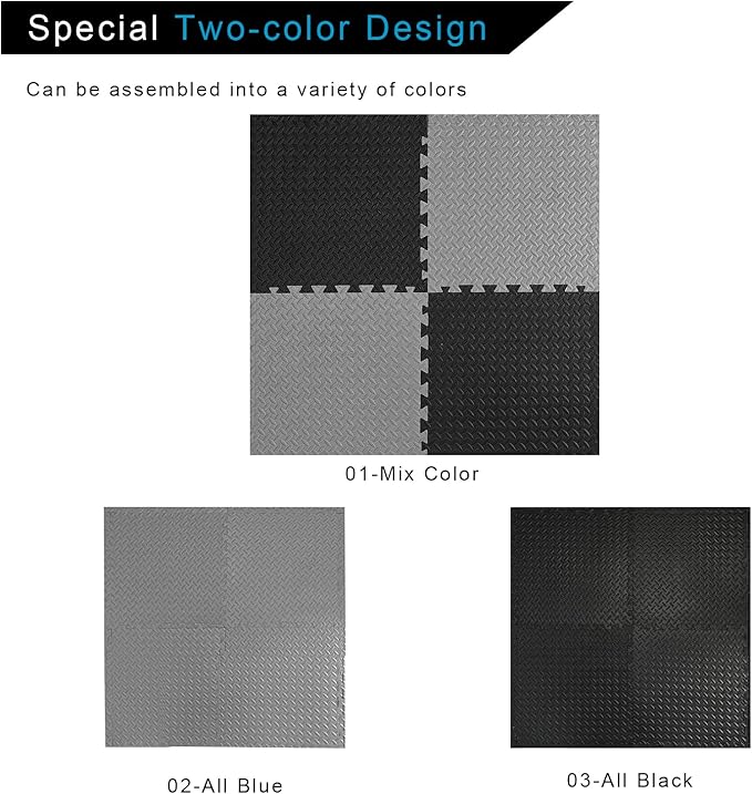 - đ ăDouble Color Designă One side of the gym tiles is blue and the other is black. Can be assembled into a variety of colors: mix color, all black or all gray gym flooring. The simple design is suitable for different styles and perfectly blends with your home gyms and fitness rooms.