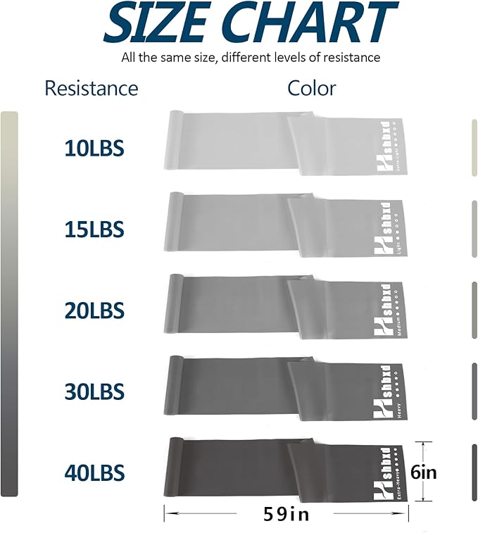 - 5 Levels Of Resistance - 5 resistance bands are 59in (150cm) long and 5.9in (15cm) wide, the resistance bands is yellow band (5 lbs), red band (10 lbs), green band (15 lbs), blue strap (20 lbs), gray strap (30 lbs).