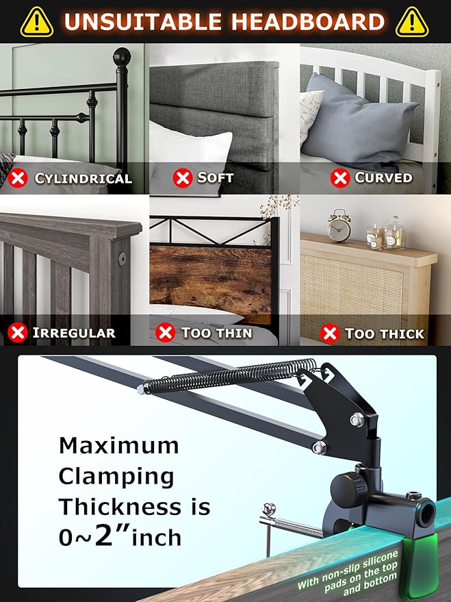 - Base for vertical and horizontal use:The base is equipped with two jacks, which can realize the vertical and horizontal use of the stand, and it is equipped with a silicone mat, which will not damage your headboard, and has high stability during use. The base can firmly clamp the table, bedside and other installation surfaces by about 40mm. Installation requires no tools or holes.