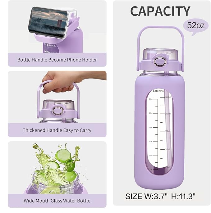 42oz/52oz/64oz Glass Water Bolttles with Straw Half Gallon Large Motivational Water Bottle with Time Marker Sports Water Bottles with Silicone Sleeve and Handle Lid Water Jug for Gym Workout