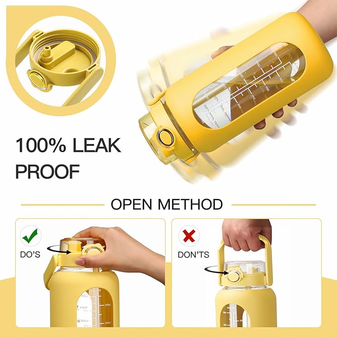 - 【Feature Details】The half gallon water bottle with straw has an anti-slip and high quality silicone sleeve to protect the glass water bottle and help prevent it from being slippery in your hands or slight bumps, it keeps standup stably.In order to make the big gym motivational water bottle easy to carry we have equipped it with handle.