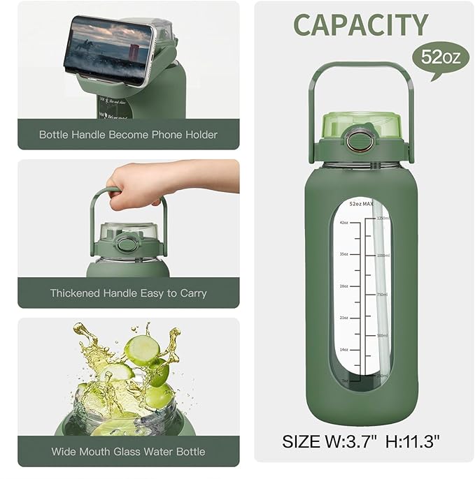 42oz/52oz/64oz Glass Water Bolttles with Straw Half Gallon Large Motivational Water Bottle with Time Marker Sports Water Bottles with Silicone Sleeve and Handle Lid Water Jug for Gym Workout