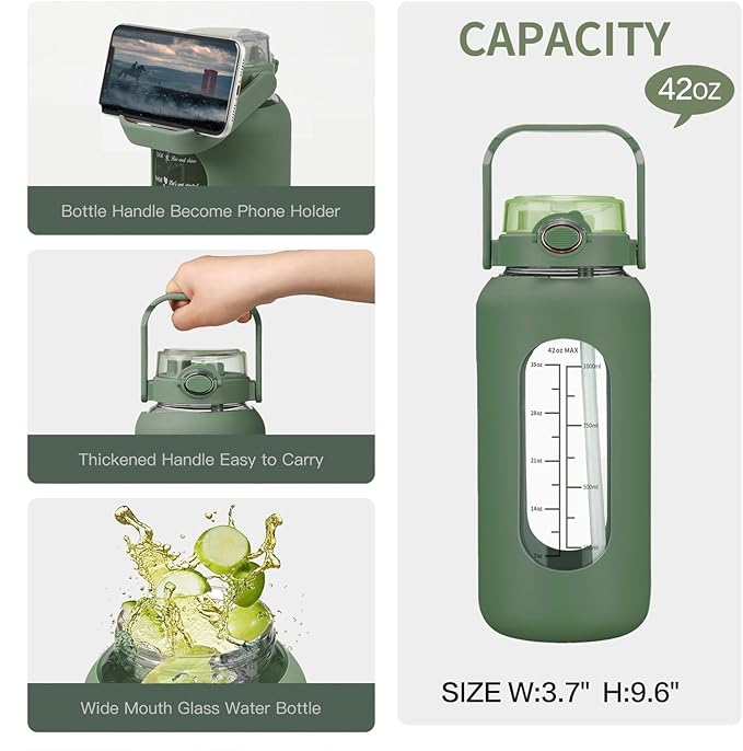 - 【Multifunctional Humanized Design】The 42 oz glass water bottle featured with latest pop up lid with premium O-ring safety lock, 100% leak-proof, and can be easily opened with one hand.The large glass bottles have two ways to drink water by a silicone straw and a hole that can be drink from directly , which is very convenient and fast.