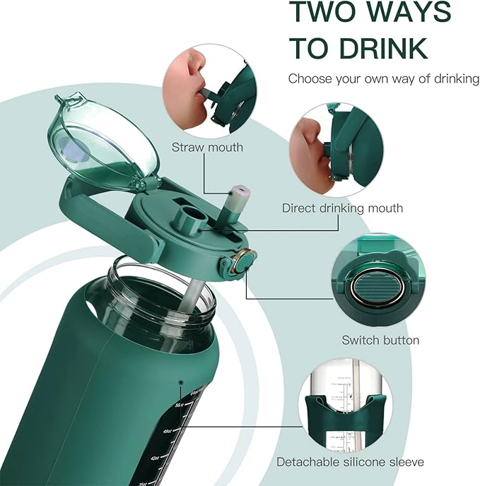 - 【Multifunctional Humanized Design】The 52 oz glass water bottle featured with latest pop up lid with premium O-ring safety lock, 100% leak-proof, and can be easily opened with one hand.The large glass bottles have two ways to drink water by a silicone straw and a hole that can be drink from directly , which is very convenient and fast.