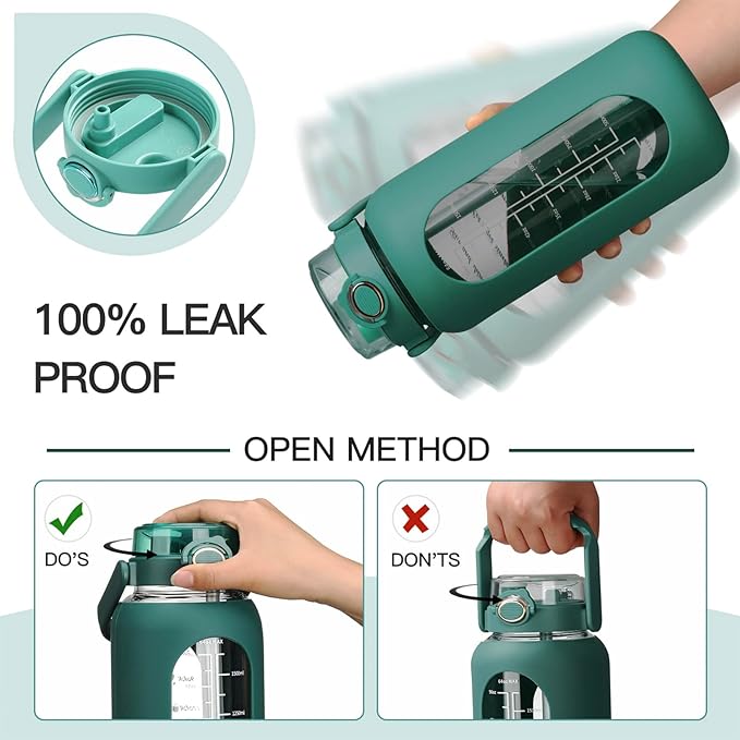 - 【Feature Details】The half gallon water bottle with straw has an anti-slip and high quality silicone sleeve to protect the glass water bottle and help prevent it from being slippery in your hands or slight bumps, it keeps standup stably.In order to make the big gym motivational water bottle easy to carry we have equipped it with handle.