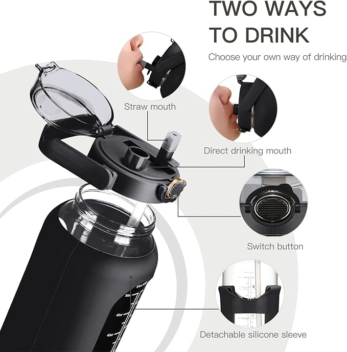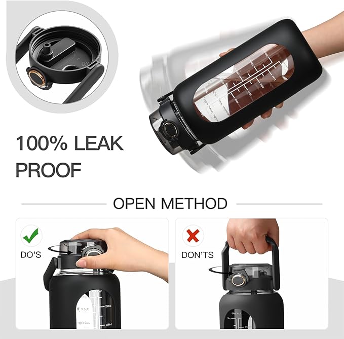 - 【Feature Details】The half gallon water bottle with straw has an anti-slip and high quality silicone sleeve to protect the glass water bottle and help prevent it from being slippery in your hands or slight bumps, it keeps standup stably.In order to make the big gym motivational water bottle easy to carry we have equipped it with handle.