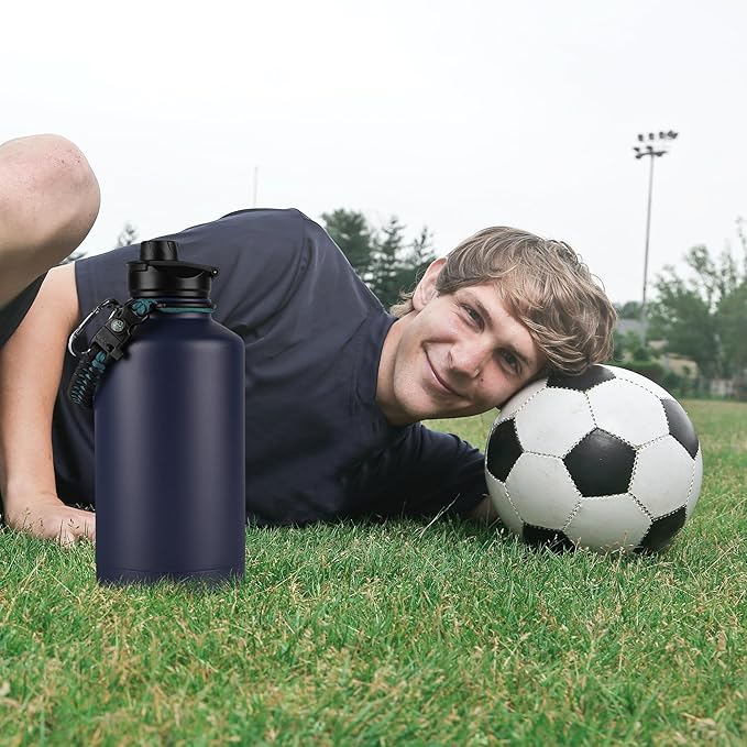 64 oz Insulated Water Bottle with Straw & Spout Lids, Stainless Steel Metal Half Gallon Water Jug with Paracord Handle, Double Wall Vacuum, Leakproof, Keep Drinks Cold & Hot, Navy