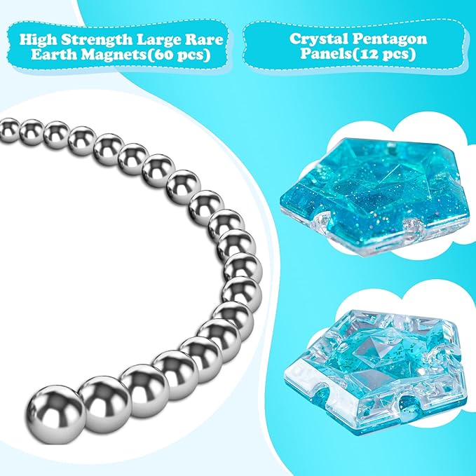 - [Excellent Quality, Unique Design]: Nothing compares to the quality & unique design of this magnetic balls, each panel has a stunning crystal and holographic glitter of high quality, durable. Made with 60 high strength neodymium magnets, magically self-aligning to over 100 shapes and formations.