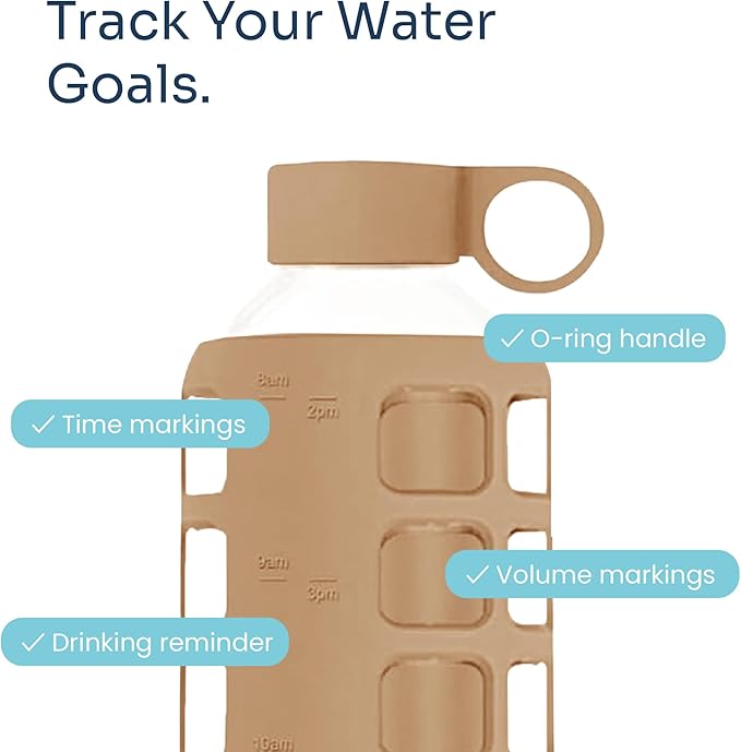 purifyou 40oz / 32oz / 22oz / 12oz Borosilicate Glass Water Bottle with Time & Volume Markers, Silicone Sleeve, Stainless Steel Lid | Reusable Glass Bottle for Water & Juice (32oz Iced Coffee)