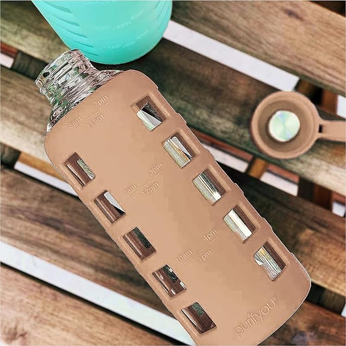 purifyou 40oz / 32oz / 22oz / 12oz Borosilicate Glass Water Bottle with Time & Volume Markers, Silicone Sleeve, Stainless Steel Lid | Reusable Glass Bottle for Water & Juice (22oz Iced Coffee)