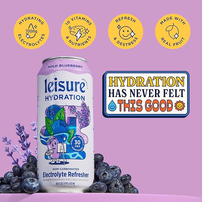 Leisure Hydration Non-Carbonated Electrolyte Refresher, Wild Blueberry Flavor - Low Sugar Nutrient Enhanced Water Beverage - Get The Best Hydration Packed w/ Magnesium & Ashwagandha For Mood & Stress Support, Non-GMO, 16 oz (12-Cans)