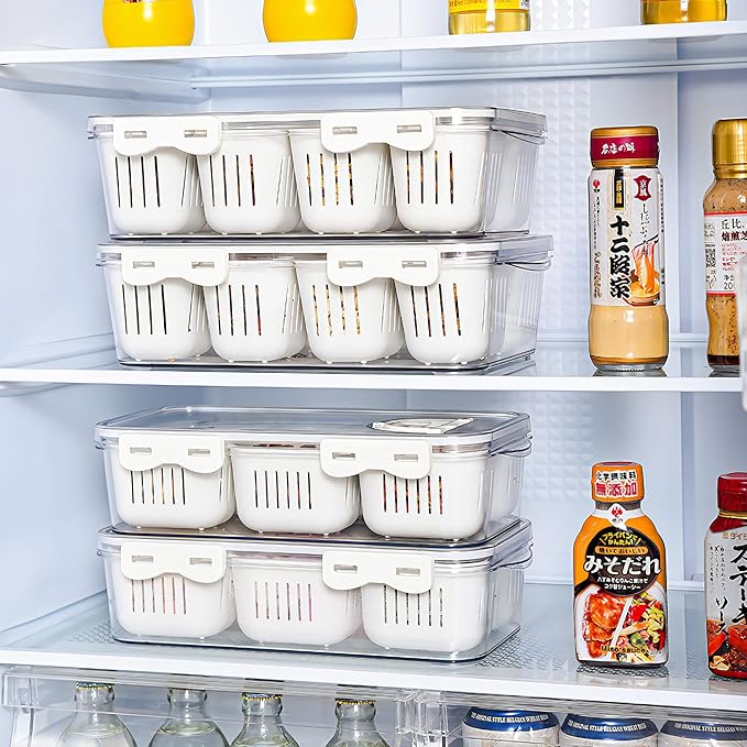 - Size: This plastic storage set including 2 large boxe and 12 removable dividers; Dividers with drain holes which can keep food dry and clean; The size of the large container is 12.4β*5.9β*3.1β,the size of the small dividers are 3.7β*2.8β*2.4β