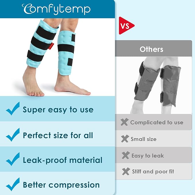 - Expanded Cover Calf & Shin Splint and Elbow Ice Pack: The effective coverage area of Comfytemp gel ice pack is twice as big as some others. Up to 26.8 inches for calf circumference, the size ensures perfect fit for any body type. Provides full coverage of the arms and Shin Splint, providing immediate, deep relief after exercise and injury, and helps reduce swelling. It is an effective treatment for post-exercise elbow injuries, calf strain and shin pain. It's a life saver after a long day!