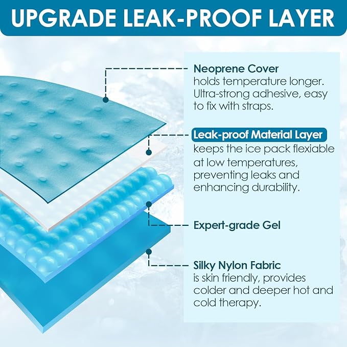 - Upgraded Leak-proof Layer: Keeps the ice bag more flexiable at low temperatures, preventing leaks and enhancing durability. Lined with nylon fabric, provides with you of a deeper cold and hot compress. Apply immediately after an injury to control swelling and inflammation of soft tissue, helping alleviate pain from a leg injury. This reusable ice pack is perfect for athletes, runners, basketball players, tennis, soccer, etc., housewives, pregnant women, workers, seniors, etc.