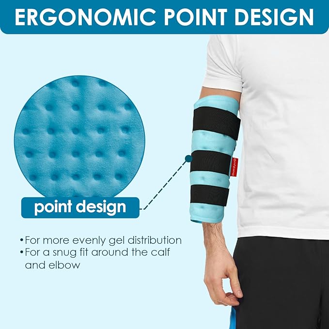 - Ergonomic Point Design: Even if more than 30% of the gel is filled, the innovatived point design makes the gel distribution more evenly, make the ice pack more snug fit the calf or elbow, prevent slipping, and obtain a more comfortable cold and hot compress experience; Its perfect design work on the Shin Splint, legs, knees, elbows, arms, ankles, and any other part of the body where you need to relieve pain! Both hot and cold compress help eliminate fatigue and pain.