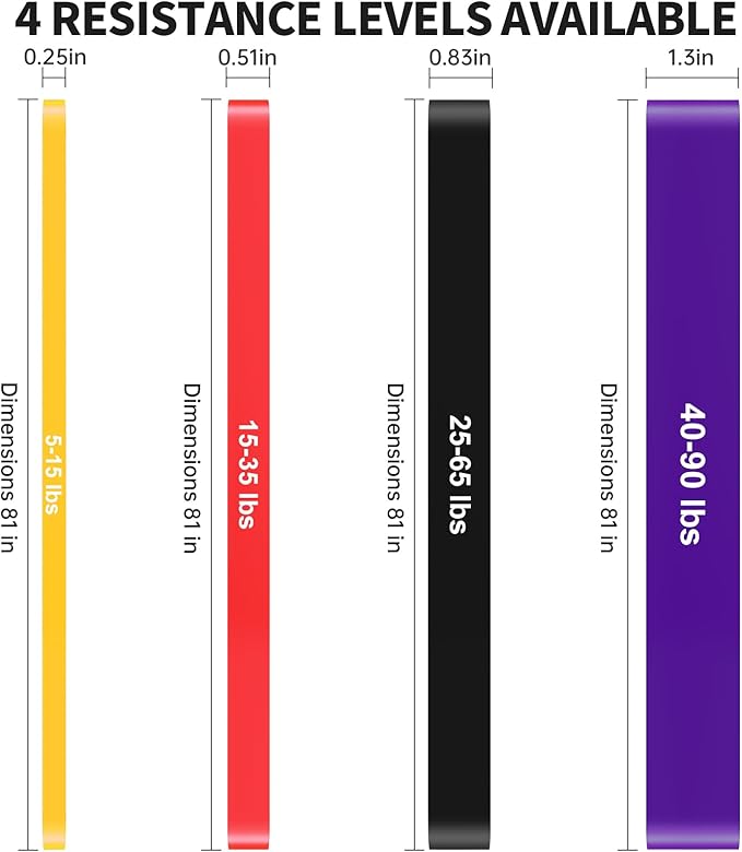 - 4 Exercise Band Levels: The package includes set of 4 exercise bands correspond to different colors, Yellow(5-15 lbs), Red(15-35 lbs), Black(25-65 lbs), Purple (40-90 lbs), 81 inches in length and can be used alone or combine multiple stretch bands for exercise to increase the challenge.