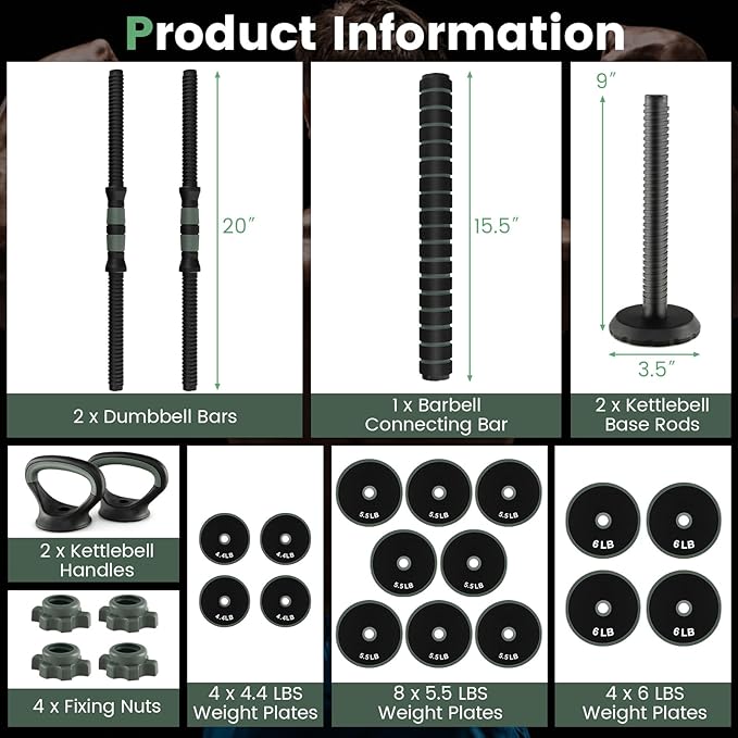 - Suitable for All Skill Level: Coming with four 4.4lbs weight plates, eight 5.5lbs weight plates and four 6lbs weight plates, this weight training equipment allows you to customize your exercise intensity, and make it suitable for your whole family.