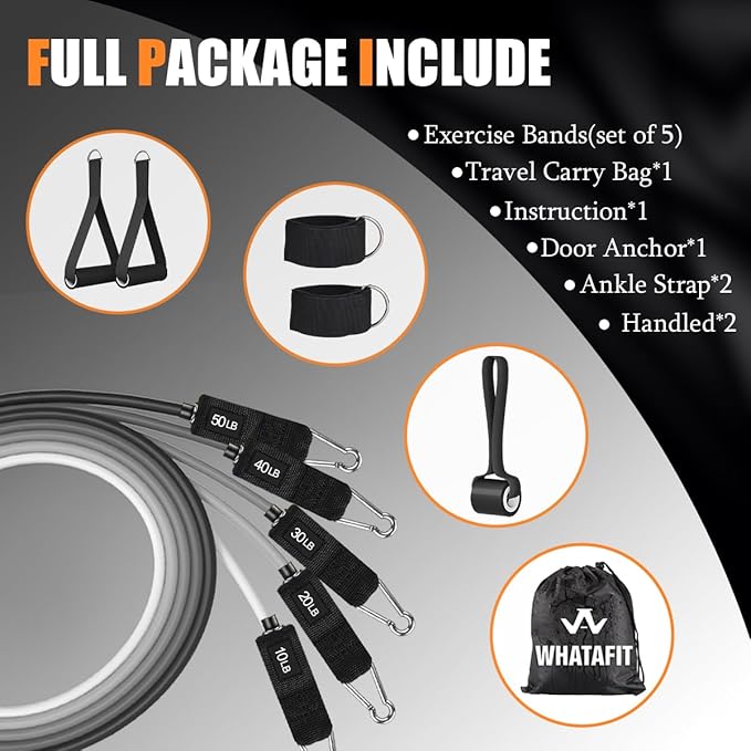 - Product list:Our fitness bands includes 5 Tube resistance Bands, 2 Soft Cushioned Handles, 2 Ankle Straps,1 Door Anchor,1 Exercise Guidance, 1 Carrying Bag