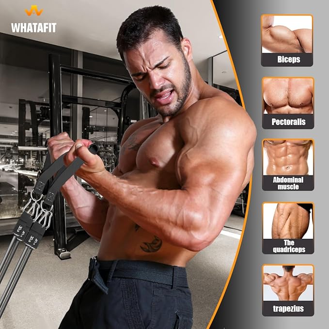 - Adjustable Resistance Bands: WHATAFIT exercise bands come with 5 different resistance level 10lbs, 20lbs, 30lbs, 40lbs and 50lbs in 5 different colors. You can use the bands You can use it independently or in combination, up to 150 lbs