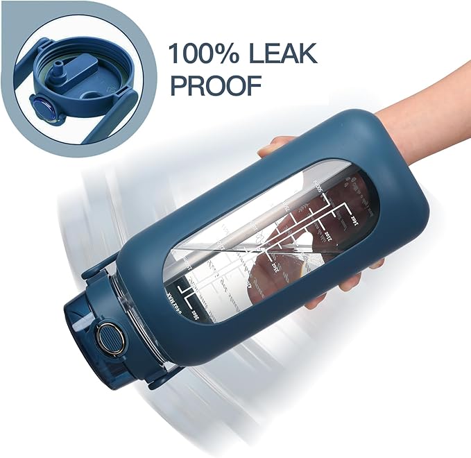 - 【Feature Details】The half gallon water bottle with straw has an anti-slip and high quality silicone sleeve to protect the glass water bottle and help prevent it from being slippery in your hands or slight bumps, it keeps standup stably.In order to make the big gym motivational water bottle easy to carry we have equipped it with handle.