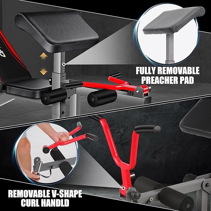 - 【Multiple Adjustable Bench Press】Designed with 7 backrest + 3 preacher curl pad positions, Incline/Flat/Decline, easily adjustable for a full-body workout;allowing you to customize the settings according to your exercise needs for different muscle groups.