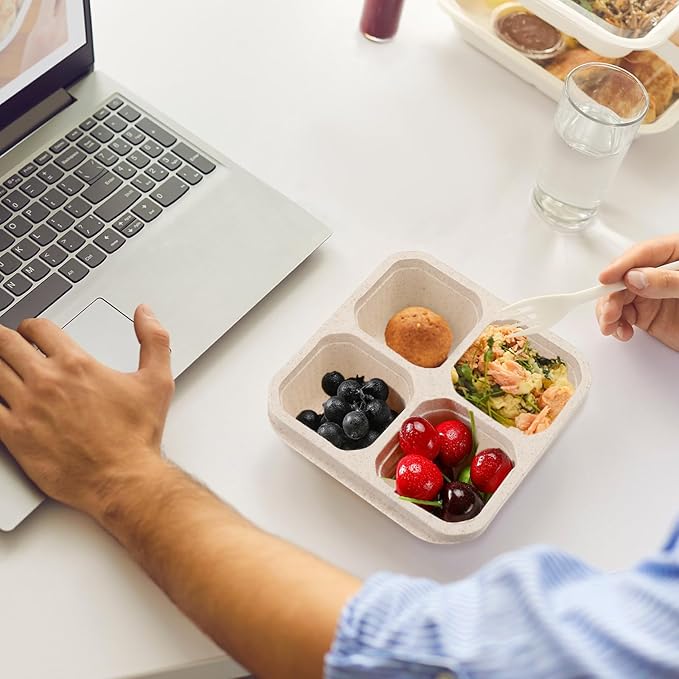12 Pcs 4 Divided Compartments Snack Containers Bento Wheat Straw Snack Box with Lid Reusable Meal Prep Lunch Box Food Storage Containers for Adults Travel Work(Beige)