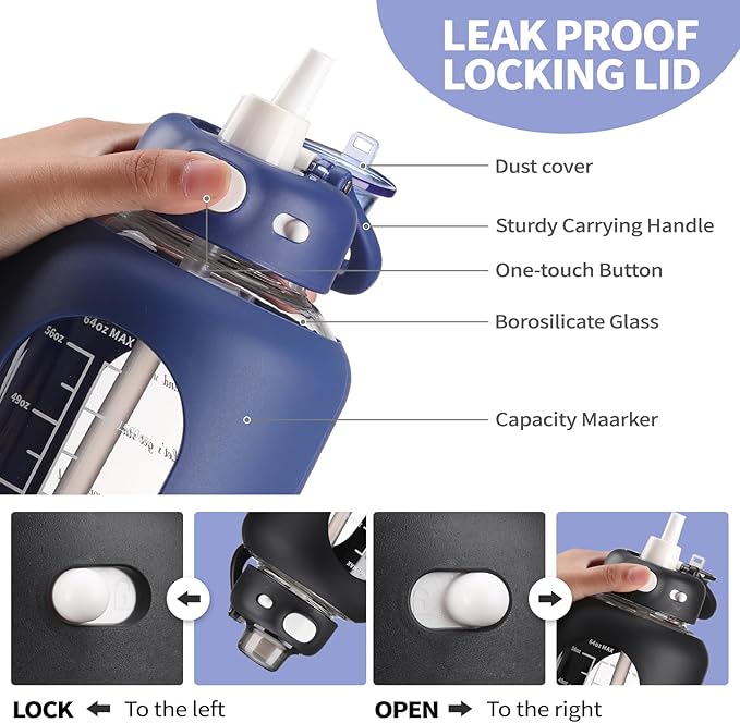 - TWO WAYS TO DRINK: This 64oz glass water bottle lid adopts food grade soft spout, sealing lid adopts lock design.When drinking,just press the button lid and it will automatically pop out, when the lock button locks, the seal is 100% leak-proof, the grip is comfortable and firm, and you can easily carry wherever you go, allowing you to carry your drink comfortably for a long time