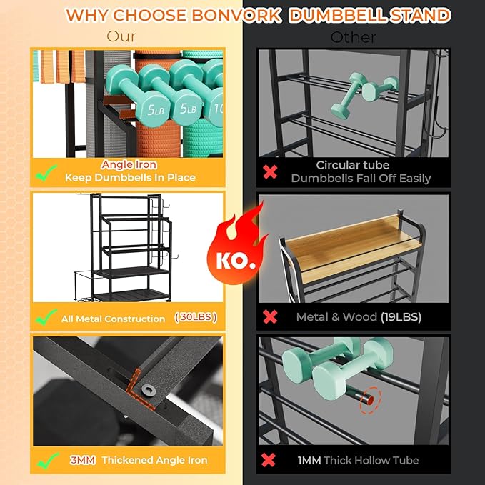 - 【THICHENED QUALITY STEEL】 Made of thickened high quality steel, this home gym storage rack can hold up to 600 pounds. Strong load bearing makes it more compatible for both light and heavy gym weights, and more suitable for a growing home gym. And coated with durable dark powder coating, the dumbbell stand can resist damage from intensive use over time. No worry about cracking.