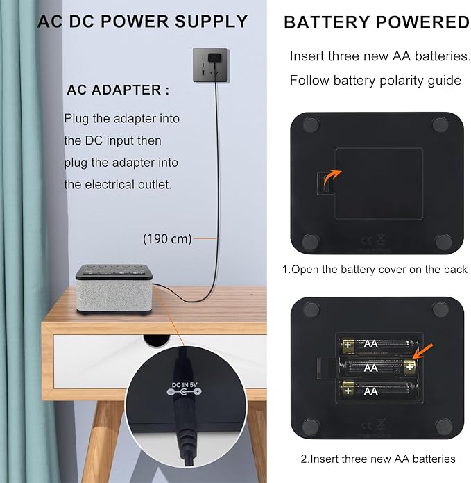 - [Plug in or Use battery for White Sounds Machine] – The sleep noise machine is powered by an included AC adapter with a micro USB cable or 3 AA batteries (Not included), making it an easy portable solution for home, office and travel.