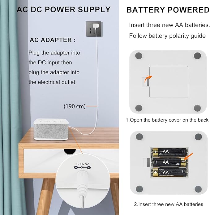 - [Plug in or Use battery for White Sounds Machine] – The sleep noise machine is powered by an included AC adapter with a micro USB cable or 3 AA batteries (Not included), making it an easy portable solution for home, office and travel.