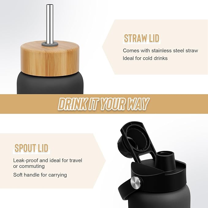 - DUAL LID VERSATILITY AND CUP HOLDER DESIGN: Our motivational 1L glass water bottle comes with both a spout lid and a straw lid. Whether you need it as a stylish tumbler or a leak-proof cute clear water bottle, our product is designed to meet your needs on various occasions, and it conveniently fits in cup holders.