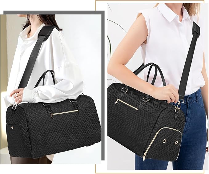 - TRAVEL BAG WITH SHOE COMPARTMENT - We have added a separate shoe compartment and a shoe bag(Size:17x12 inches). Travel bags for women has a shoe compartment to hold your shoes or dirty clothes, making it easy to separate them from your clean clothes when travelling. It also comes with a toiletry bag in which you can put your cosmetics, skincare products or toiletries.(Black Gold)
