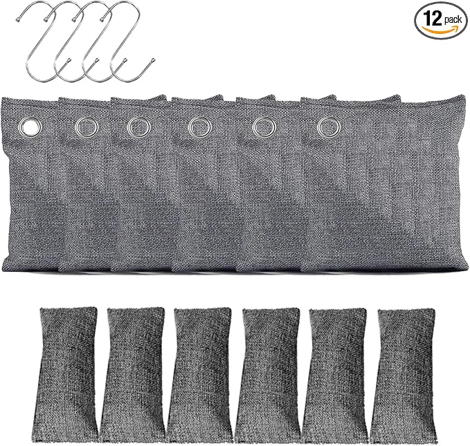 - 【12 bags with 6 hooks 】 This bags set includes 12 bags and 6 hooks in a Resealable Bag. A bamboo charcoal air purifying bag can transform the air you breathe. Other activated charcoal bags use low-grade charcoal to save money.