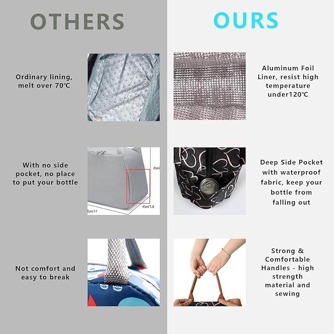 - ❤KEEP FRESH & WARM: This insulated lunch bag is made of water-resistant leakproof oxford cloth, easy clean food safe aluminum foil inner lining, and padded with thicken EPE foam will keep your food cold or thermal for 4-6 hours. Tips: Putting ice packs into the bag could keep cold for longer time.