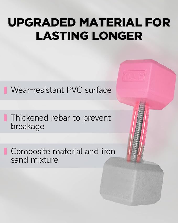- [NO SCROLLING] Our dumbbells feature a hexagonal design with a textured PVC surface so you don't have to worry about rolling while stacking and doing floor moves.