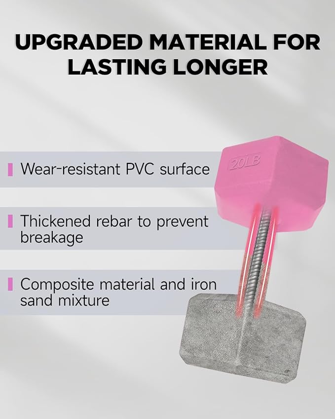 - [NO SCROLLING] Our dumbbells feature a hexagonal design with a textured PVC surface so you don't have to worry about rolling while stacking and doing floor moves.
