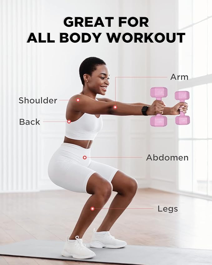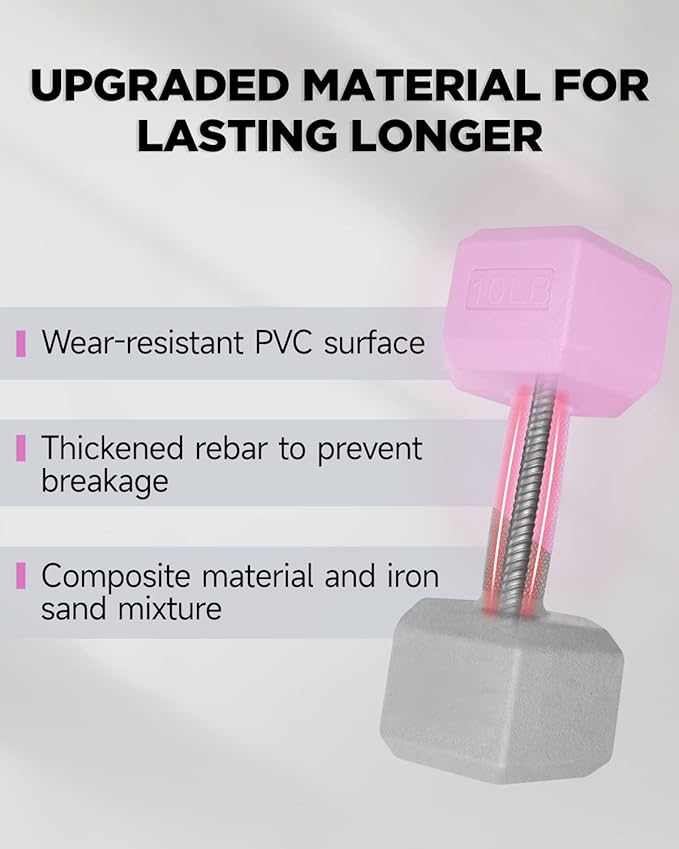 - [NO SCROLLING] Our dumbbells feature a hexagonal design with a textured PVC surface so you don't have to worry about rolling while stacking and doing floor moves.