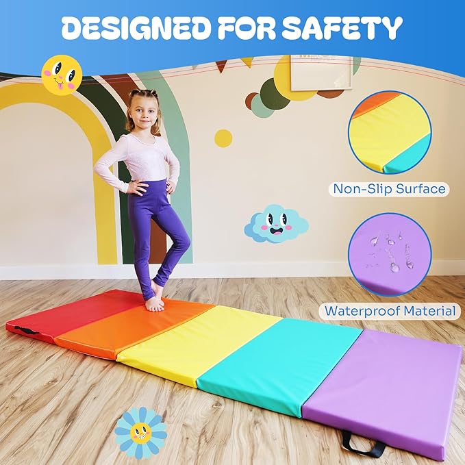 - Colorful - The tumbling mat features 5 panels in the colors of the rainbow. The mats are easily foldable. When open, the mat measures 30" x 78" and 1.5" thick.