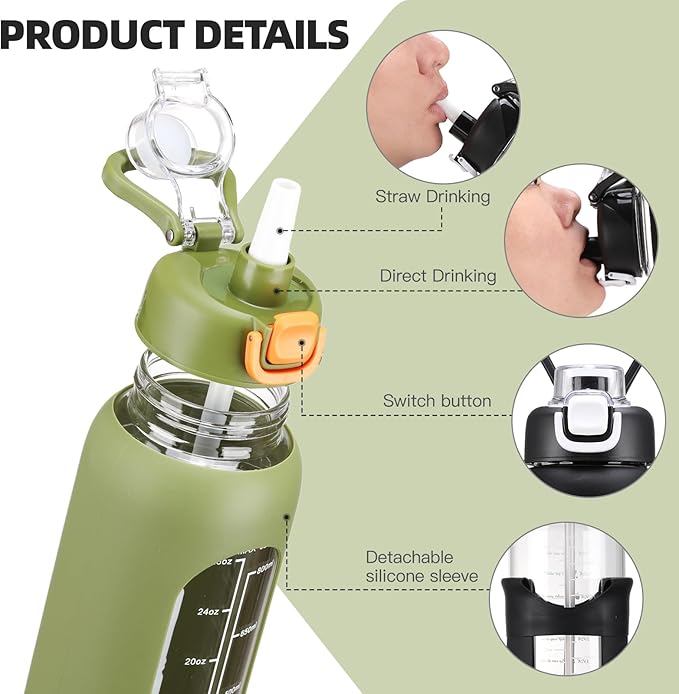 32 oz Glass Water Bolttles with Straw Large Motivational Water Bottle with Time Marker Sports Water Bottles with Silicone Sleeve and Handle Lid Water Jug for Gym Workout