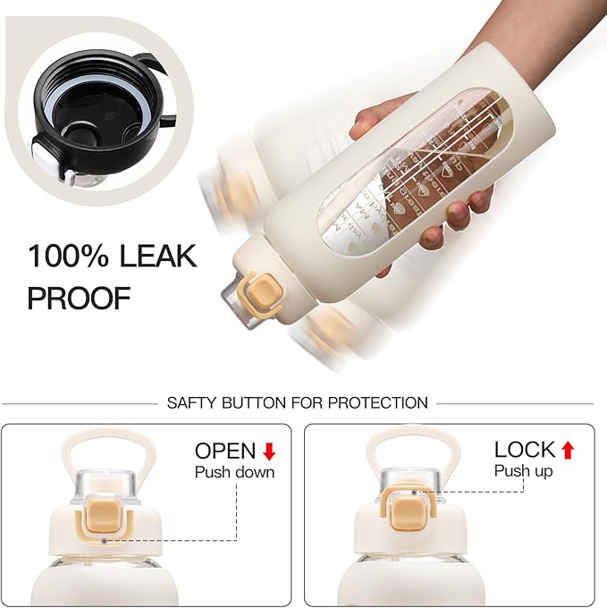 - 【Multifunctional Humanized Design】The 32 oz glass water bottle featured with latest pop up lid with premium safety lock, 100% leak-proof, and can be easily opened with one hand.The large glass bottles have two ways to drink water by a straw and a hole after remove the straw that can be drink from directly , which is very convenient and fast.