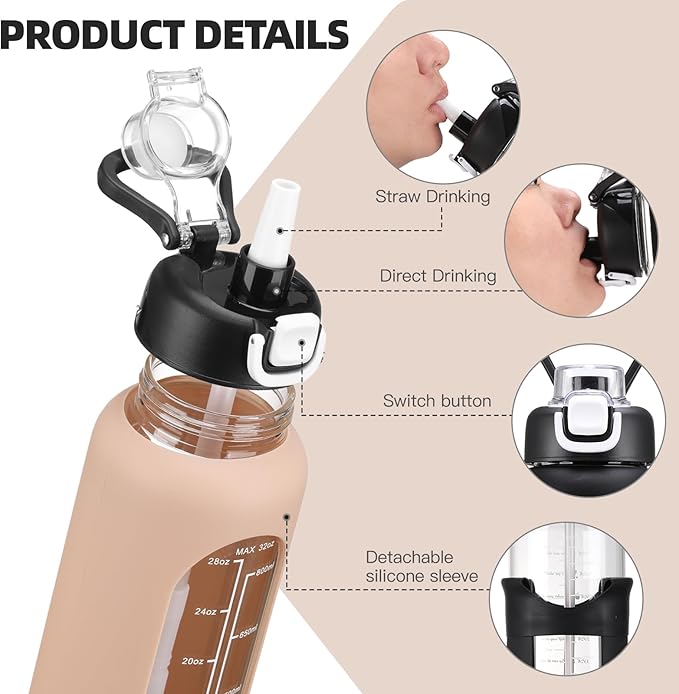 32 oz Glass Water Bolttles with Straw Large Motivational Water Bottle with Time Marker Sports Water Bottles with Silicone Sleeve and Handle Lid Water Jug for Gym Workout